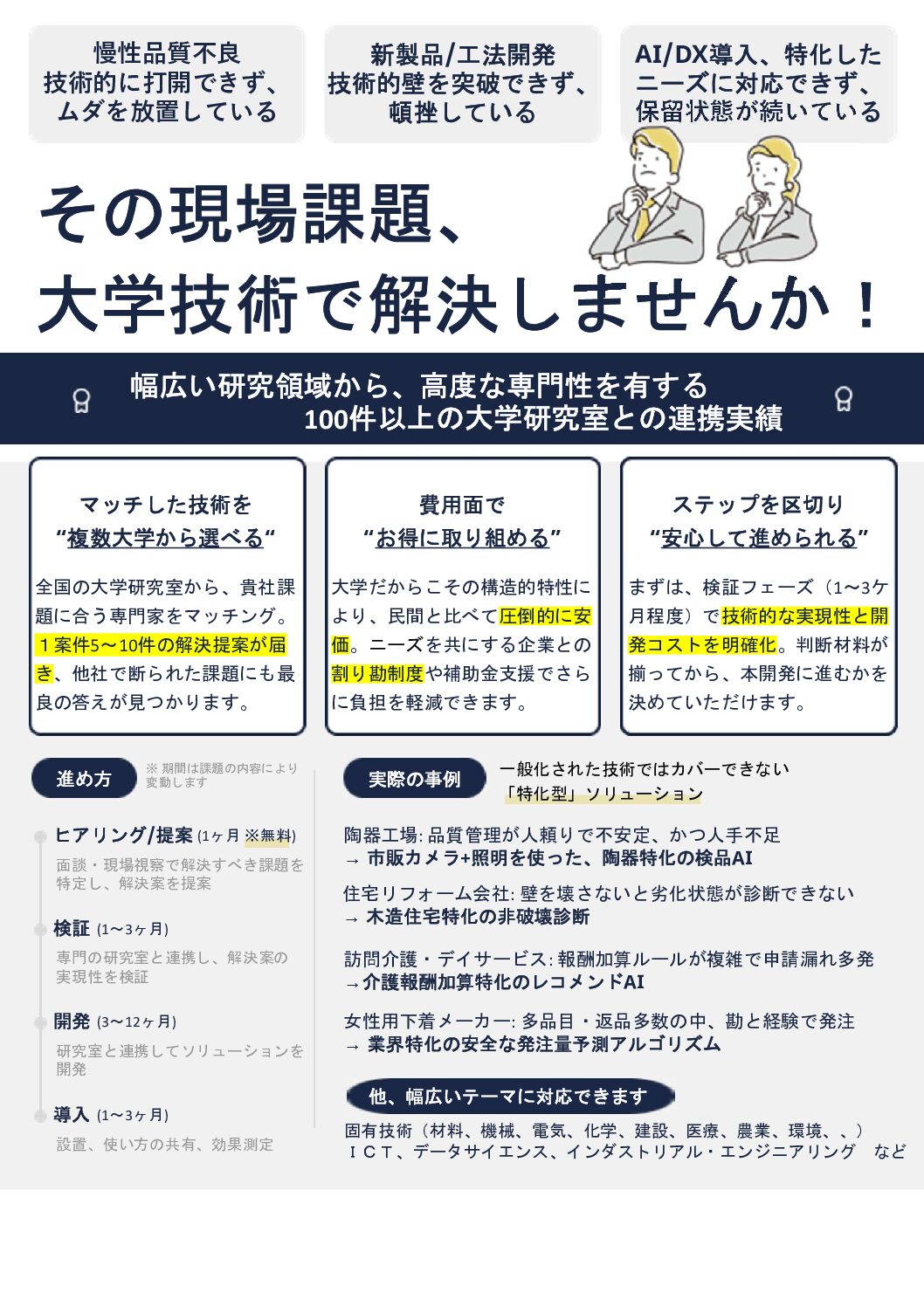 技術課題を抱える企業の多くが、 「大学に相談するのは敷居が高い」 「費用が高そう」 「何をどう頼めばいいか分からない」 と感じています。